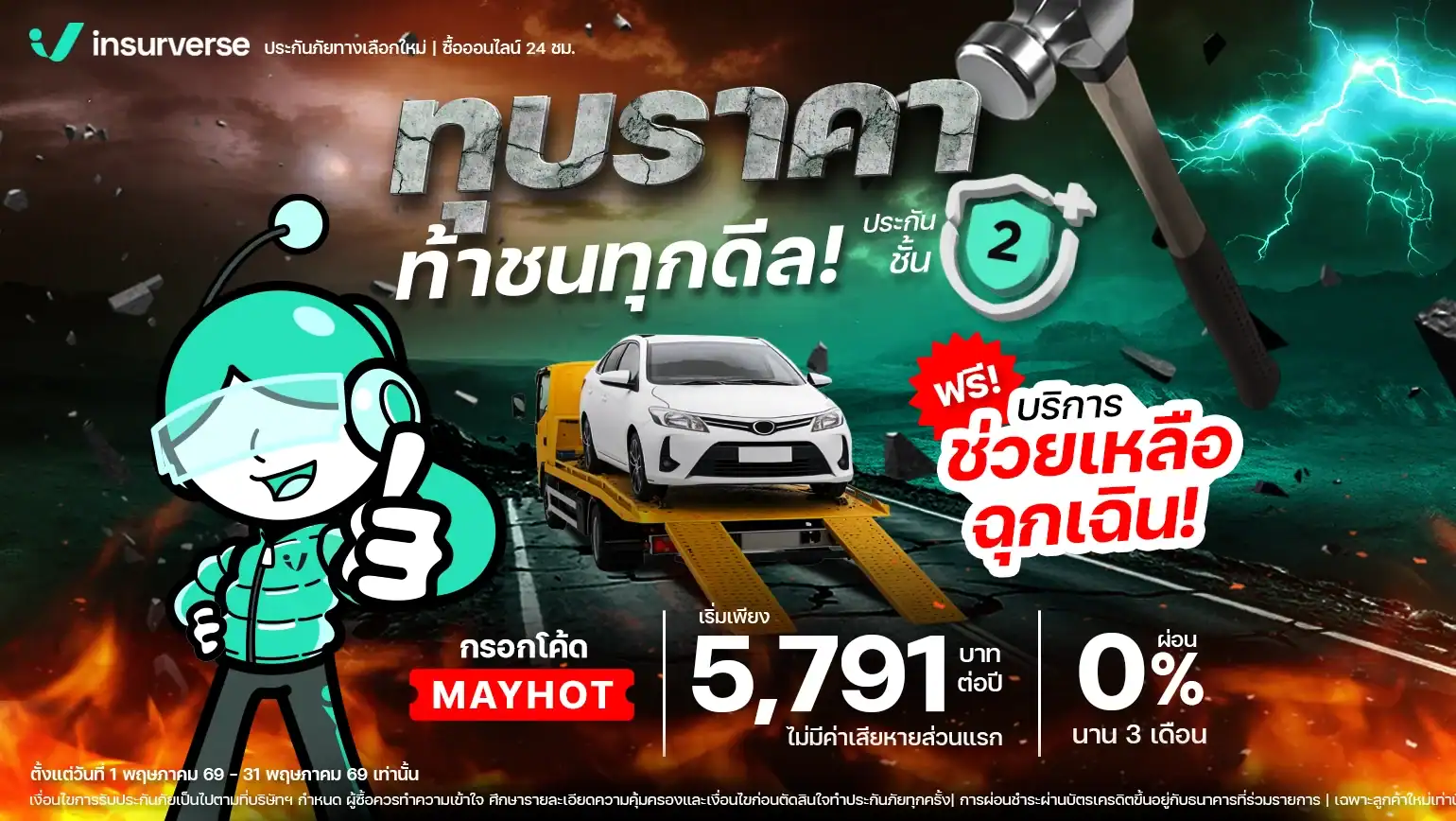 ทุบให้ยับ! ประกันชั้น 2+ เดือดที่สุดของปี เริ่มต้นเพียง 5,791.- ต่อปี ผ่อนสบาย 0% นาน 3 เดือน ฟรี! ช่วยเหลือฉุกเฉินตลอด 24 ชม. เก็บโค้ด MAYHOT คัดลอกโค้ด เช็กราคาก่อนใคร! คลิกเลย ระยะเวลาโปรโมชั่น expand_more 1 พฤษภาคม – 31 พฤษภาคม 2569 สิทธิพิเศษสำหรับลูกค้า expand_more ส่วนลด 5% สำหรับประกันรถยนต์ภาคสมัครใจชั้น 2+ หมายเหตุ expand_more เงื่อนไขการรับประกันภัยเป็นไปตามที่บริษัทฯ กำหนด ผู้ซื้อควรทำความเข้าใจ ศึกษารายละเอียดความคุ้มครองและเงื่อนไขก่อนตัดสินใจทำประกันภัยทุกครั้ง การผ่อนชำระผ่านบัตรเครดิตขึ้นอยู่กับธนาคารที่ร่วมรายการ สิทธิพิเศษนี้ มอบให้กับลูกค้าใหม่ที่ซื้อประกันภัยรถยนต์ภาคสมัครใจชั้น 2+ ผ่านช่องทาง www.insurverse.co.th ไม่สามารถใช้ร่วมกับโปรโมชันอื่นๆ หรือการต่ออายุประกันภัยของบริษัทฯ ได้ รายละเอียดมูลค่าเบี้ยประกันภัยข้างต้นเป็นราคาสำหรับประกันรถยนต์ภาคสมัครใจชั้น 2+ แบบระบุส่วนลดของโปรโมชันทุบราคา รายการส่งเสริมการขายดำเนินการโดย บริษัท เลมอน-เอด (ประเทศไทย) จำกัด (LEMONAIDE) ระยะเวลาโปรโมชัน ตั้งแต่วันที่ 1 พฤษภาคม 2569 – 31 พฤษภาคม 2569 เท่านั้น