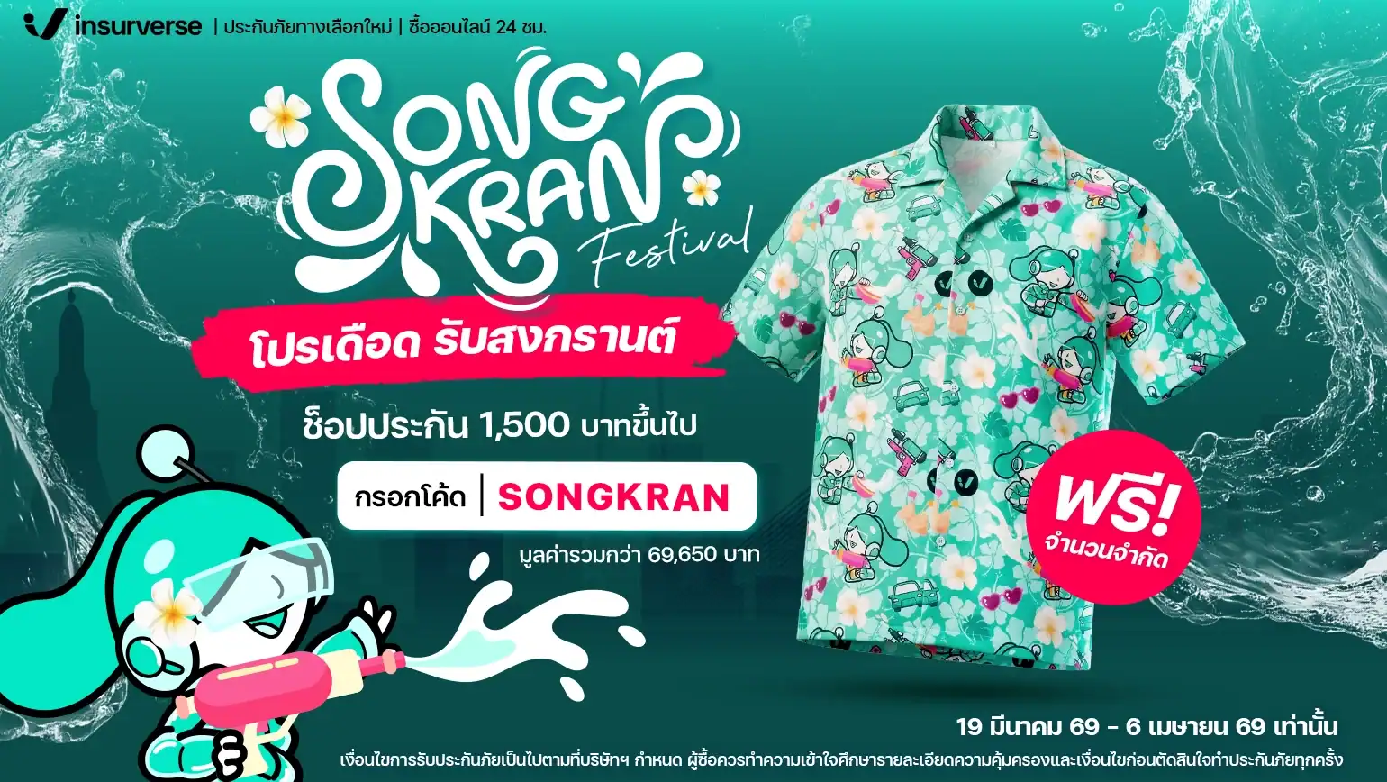 สงกรานต์นี้ insurverse แจกฉ่ำ! เสื้อฮาวายลิมิเต็ดกว่า 199 ตัว เพียงซื้อประกัน 1,500 บาทขึ้นไป กรอกโค้ด SONGKRAN รับฟรี! เสื้อฮาวายลิมิเต็ดรับสงกรานต์ ใส่เล่นน้ำแบบไม่ซ้ำใครทันที SONGKRAN คัดลอกโค้ด เช็กราคาและดูความคุ้มครอง ก่อนสิทธิ์หมด คลิกเลย ระยะเวลาโปรโมชั่น expand_more 19 มีนาคม 2569 – 6 เมษายน 2569 สิทธิพิเศษสำหรับลูกค้า expand_more รับฟรีเสื้อฮาวาย limited edition รับสงกรานต์ของ insurverse มูลค่า 350 บาท เมื่อช็อปประกันผ่านช่องทาง www.insurverse.co.th 1,500 บาทขึ้นไป พร้อมกรอกโค้ดหน้าเว็บไซต์ หมายเหตุ expand_more เงื่อนไขการรับประกันภัยเป็นไปตามที่บริษัทฯ กำหนด ผู้ซื้อควรทำความเข้าใจ ศึกษารายละเอียดความคุ้มครองและเงื่อนไขก่อนตัดสินใจทำประกันภัยทุกครั้ง สิทธิพิเศษนี้ มอบให้กับลูกค้าใหม่ที่ซื้อประกันภัยผ่านช่องทาง www.insurverse.co.th เท่านั้น ไม่สามารถใช้ร่วมกับโปรโมชันอื่นๆ หรือการต่ออายุประกันภัยของบริษัทฯ ได้ รายการส่งเสริมการขายดำเนินการโดย บริษัท อะมิตี้ อินชัวร์รันซ์ โบรคเกอร์ จำกัด ของสมนาคุณไม่สามารถโอน, ขายสิทธิ์ให้ท่านอื่น เปลี่ยนแปลงเป็นเงินสด หรือส่วนลดอื่นๆ ได้ บริษัทฯ จะจัดส่งของของสมนาคุณภายใน 15 วันทำการหลังจากออกกรมธรรม์ผ่านช่องทางไปรษณีย์ ระยะเวลาโปรโมชัน ตั้งแต่วันที่ 19 มีนาคม 2569 – 6 เมษายน 2569 เท่านั้น
